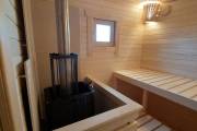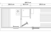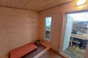 В дополнение к отличному внешнему дизайну модель обладает очень удобной планировкой. На скромных 13 квадратах размещены довольно просторная парилка (уже полностью оборудованная); душевая кабинка; большая комната отдыха.